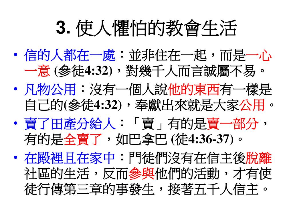 3. 使人懼怕的教會生活 • 信的人都在一處:並非住在一起,而是一心一意(參徒4:32),對幾千人而言誠屬不易。 • 凡物公用:沒有一個人說他的東西有一樣是自己的(參徒4:32),奉獻出來就是大家公用。 • 賣了田產分給人:「賣」有的是賣一部分,有的是全賣了,如巴拿巴(徒4:36-37)。 • 在殿裡且在家中:門徒們沒有在信主後脫離社區的生活,反而參與他們的活動,才有使徒行傳第三章的事發生,接著五千人信主。