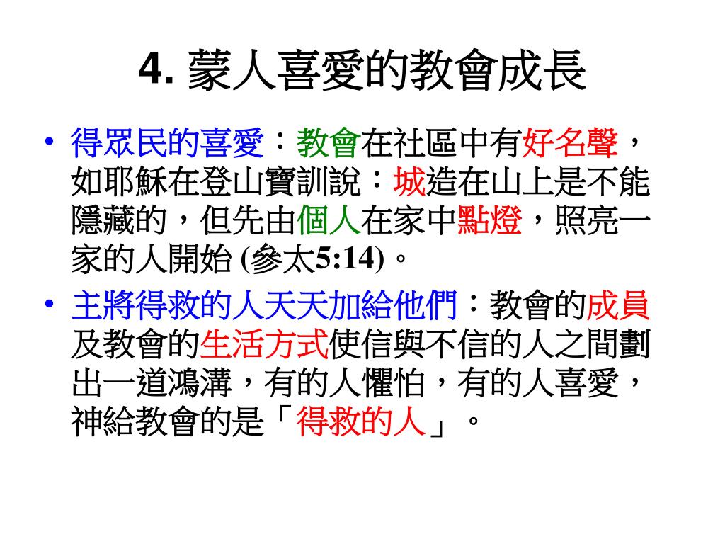 4. 蒙人喜愛的教會成長 • 得眾民的喜愛:教會在社區中有好名聲,如耶穌在登山寶訓說:城造在山上是不能隱藏的,但先由個人在家中點燈,照亮一家的人開始 (參太5:14)。 • 主將得救的人天天加給他們:教會的成員及教會的生活方式使信與不信的人之間劃出一道鴻溝,有的人懼怕,有的人喜愛,神給教會的是「得救的人」。