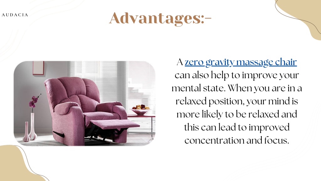 Advantages:- A zero gravity massage chair can also help to improve your mental state. When you are in a relaxed position, your mind is more likely to be relaxed and this can lead to improved concentration and focus.