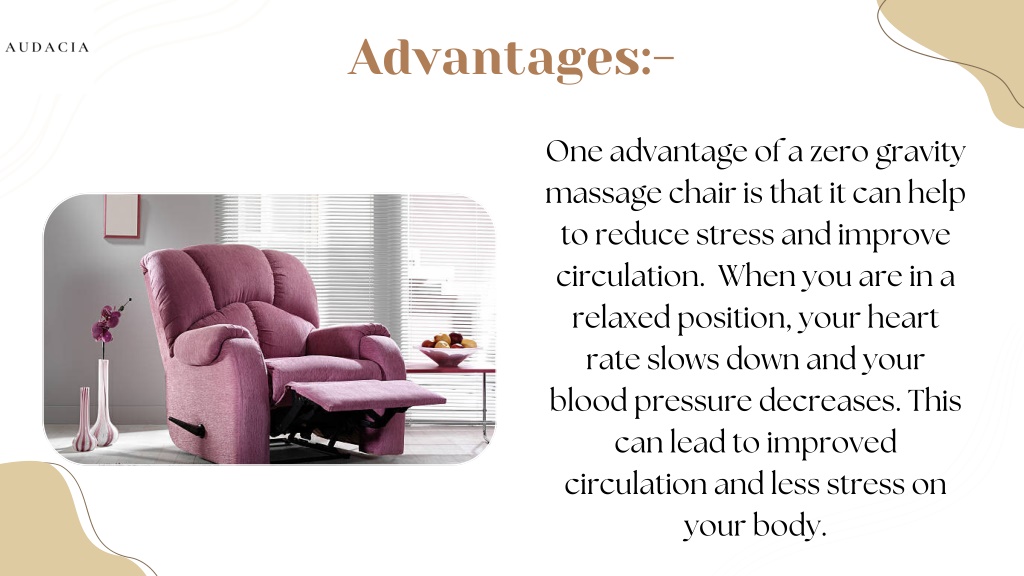 Advantages:- One advantage of a zero gravity massage chair is that it can help to reduce stress and improve circulation. When you are in a relaxed position, your heart rate slows down and your blood pressure decreases. This can lead to improved circulation and less stress on your body.