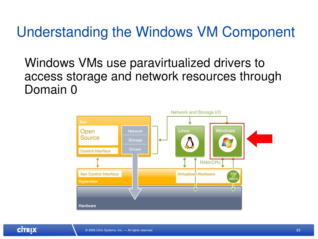 Understanding the Windows VM Component Windows VMs use paravirtualized drivers to access storage and network resources through Domain 0