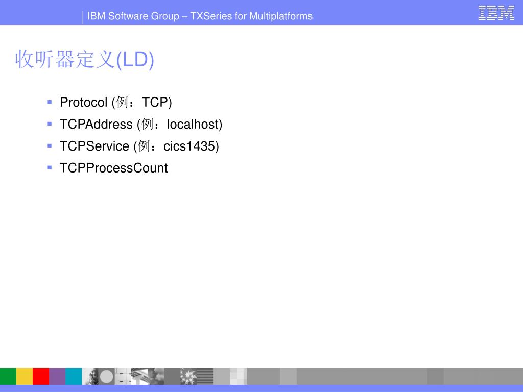 收听器定义(LD) • Protocol(例:TCP) • TCPAddress(例:localhost) • TCPService(例:cics1435) • TCPProcessCount