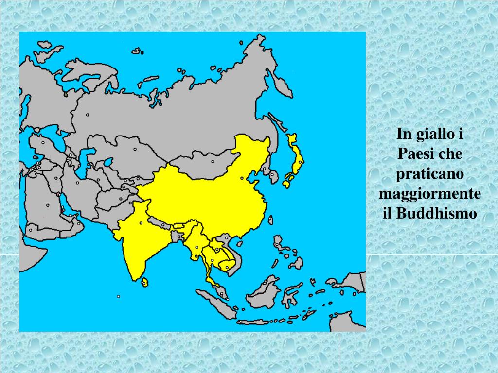 DOVE VIENE PRATICATA • Fino ad oggi è rimasto religione di stato solo in Thailandia e Buthan • È la religione dominante nell’Asia sud-orientale in paesi come Sri Lanka, Birmania, Laos e Cambogia. Ma costituisce, anche, una delle più grandi forze religiose in Cina, Giappone, Tibet e India • Negli ultimi tempi ha raggiunto qualche isola del Pacifico e alcune zone dell’America