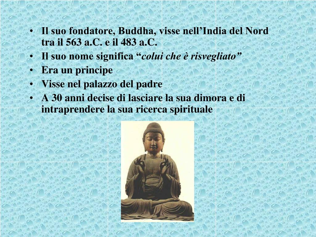Il suo fondatore, Buddha, visse nell’India del Nord tra il 563 a.C. e il 483 a.C. • Il suo nome significa “colui che è risvegliato” • Era un principe • Visse nel palazzo del padre • A 30 anni decise di lasciare la sua dimora e di intraprendere la sua ricerca spirituale