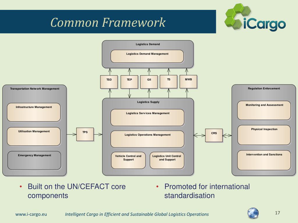 WP 1 Objective • Provide common foundations (including semantics) for cooperative planning, execution and completion of co-modal, low-carbon freight transport, taking into account: • The viewpoint and requirements of the different private and public involved stakeholders; • On-going industry and standardization activities; • Relevant physical and logical entities that need to be included in the iCargo common framework.