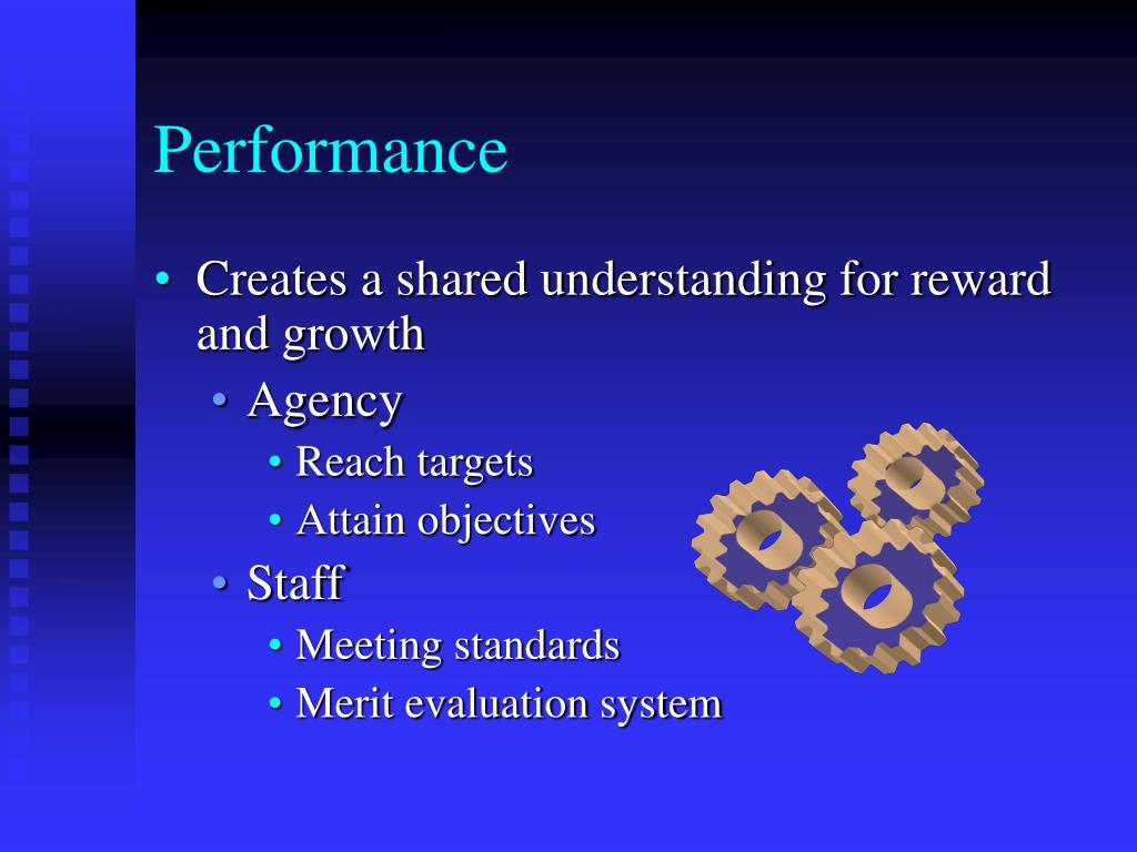 Performance • Creates a shared understanding for reward and growth • Agency • Reach targets • Attain objectives • Staff • Meeting standards • Merit evaluation system