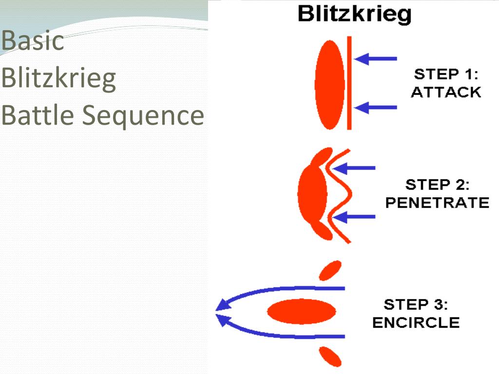 UNIQUE GERMAN MILITARY TERMS • “SCHWERPUNKT”: • CONCENTRATION OF AN ARMY’S FORCES AGAINST A TARGETED “WEAK” POINT TO ACHIEVE A RAPID BREAKTHROUGH INTO AN ENEMY’s REAR-ECHELON AREAS • REFERRED TO BY WESTERN NATIONS AS… • “BLITZKRIEG” - TRANSLATION = “LIGHTNING WAR” • BATTLEFIELD STRATEGY DEVELOPED BY GERMANY IN THE LATE 1930’s • A COMBINED-ARMS METHOD OF WARFARE EMPLOYING A COMBINATION OF THE FOLLOWING ELEMENTS: • ARMOR • AIR POWER • AIRBORNE UNITS • INFANTRY MOBILITY & ASSAULT • ARTILLERY • BASED ON THE FOLLOWING OBJECTIVES • NEUTRALIZING ENEMY AIR POWER AT THE OUTSET OF ANY CAMPAIGN • USE OF AIRBORNE ELEMENTS TO DISRUPT ENEMY COMMUNICATIONS & RESERVE SUPPORT • SIMULTANEOUS USE OF INFANTRY ASSAULT, TANK (PANZER) ASSAULT & ARTILLERY SUPPORT TO NEUTRALIZE ENEMY’S MOBILITY • ARMORED THRUST (“PUNCH”)THROUGH ENEMY LINES TO PENETRATE INTO ENEMY RESERVE AREAS • ULITMATE GOAL: ENCIRCLEMENT OF ENEMY UNITS, DESTRUCTION OF UNITS, AND BREAKOUT INTO OPEN COUNTRYSIDE • ARMOR, INFANTRY MOBILITY CAN THEN BE USED TO DISRUPT ENEMY’S ABILITY TO RECOVER