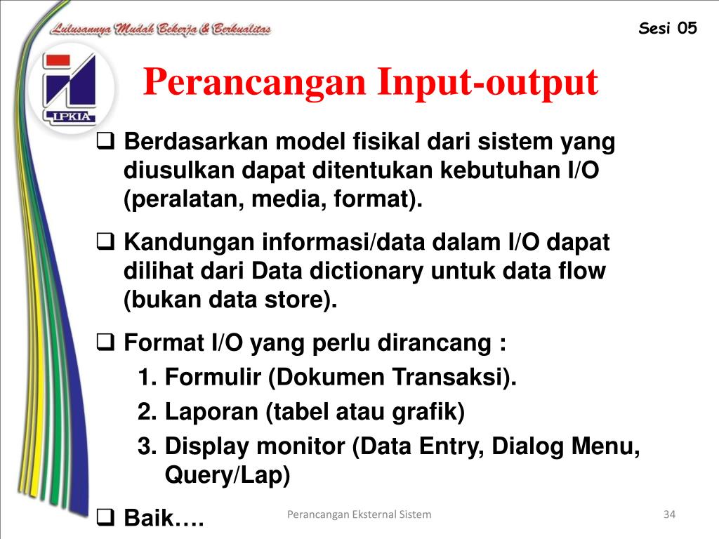 Sesi 05 Perancangan Input-output (lanjutan)… • Baik Formulir maupun Laporan dapat dihasilkan dengan menggunakan: • Tulisan tangan • Mesin Tik • Printer • Hasil tahap ini disajikan dengan menunjukkan format I/O yang dirancang serta uraian mengenai cara penggunaannya termasuk kodifikasi dari data item kode atau nomor. Perancangan Eksternal Sistem