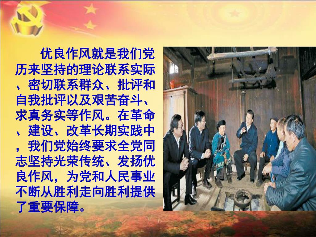 优良作风就是我们党历来坚持的理论联系实际、密切联系群众、批评和自我批评以及艰苦奋斗、求真务实等作风。在革命、建设、改革长期实践中,我们党始终要求全党同志坚持光荣传统、发扬优良作风,为党和人民事业不断从胜利走向胜利提供了重要保障。优良作风就是我们党历来坚持的理论联系实际、密切联系群众、批评和自我批评以及艰苦奋斗、求真务实等作风。在革命、建设、改革长期实践中,我们党始终要求全党同志坚持光荣传统、发扬优良作风,为党和人民事业不断从胜利走向胜利提供了重要保障。