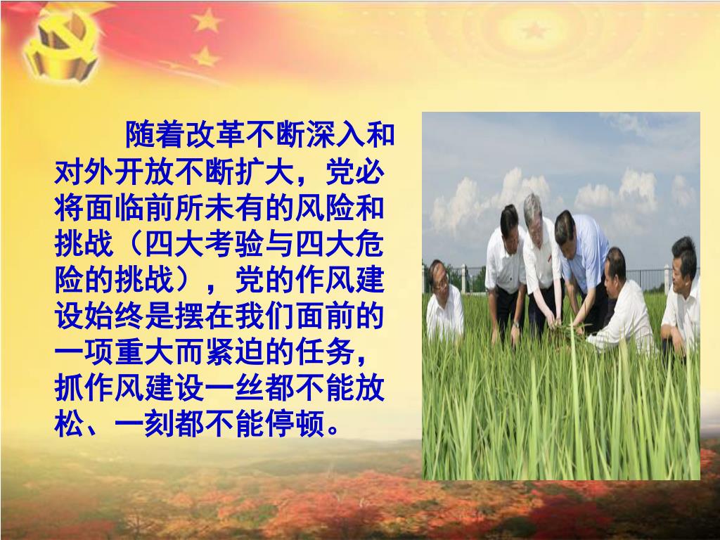 随着改革不断深入和对外开放不断扩大,党必将面临前所未有的风险和挑战(四大考验与四大危险的挑战),党的作风建设始终是摆在我们面前的一项重大而紧迫的任务,抓作风建设一丝都不能放松、一刻都不能停顿。