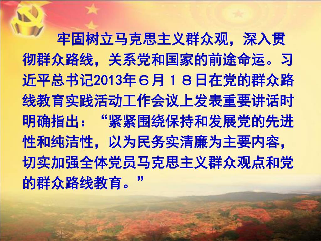 牢固树立马克思主义群众观,深入贯彻群众路线,关系党和国家的前途命运。习近平总书记2013年6月18日在党的群众路线教育实践活动工作会议上发表重要讲话时明确指出:“紧紧围绕保持和发展党的先进性和纯洁性,以为民务实清廉为主要内容,切实加强全体党员马克思主义群众观点和党的群众路线教育。”牢固树立马克思主义群众观,深入贯彻群众路线,关系党和国家的前途命运。习近平总书记2013年6月18日在党的群众路线教育实践活动工作会议上发表重要讲话时明确指出:“紧紧围绕保持和发展党的先进性和纯洁性,以为民务实清廉为主要内容,切实加强全体党员马克思主义群众观点和党的群众路线教育。”