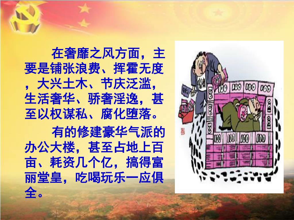 在奢靡之风方面,主要是铺张浪费、挥霍无度,大兴土木、节庆泛滥,生活奢华、骄奢淫逸,甚至以权谋私、腐化堕落。在奢靡之风方面,主要是铺张浪费、挥霍无度,大兴土木、节庆泛滥,生活奢华、骄奢淫逸,甚至以权谋私、腐化堕落。 有的修建豪华气派的办公大楼,甚至占地上百亩、耗资几个亿,搞得富丽堂皇,吃喝玩乐一应俱全。