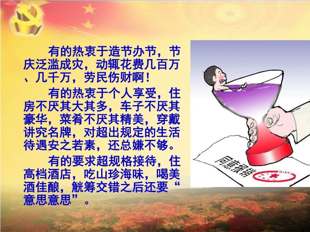 有的热衷于造节办节,节庆泛滥成灾,动辄花费几百万、几千万,劳民伤财啊!有的热衷于造节办节,节庆泛滥成灾,动辄花费几百万、几千万,劳民伤财啊! 有的热衷于个人享受,住房不厌其大其多,车子不厌其豪华,菜肴不厌其精美,穿戴讲究名牌,对超出规定的生活待遇安之若素,还总嫌不够。 有的要求超规格接待,住高档酒店,吃山珍海味,喝美酒佳酿,觥筹交错之后还要“意思意思”。