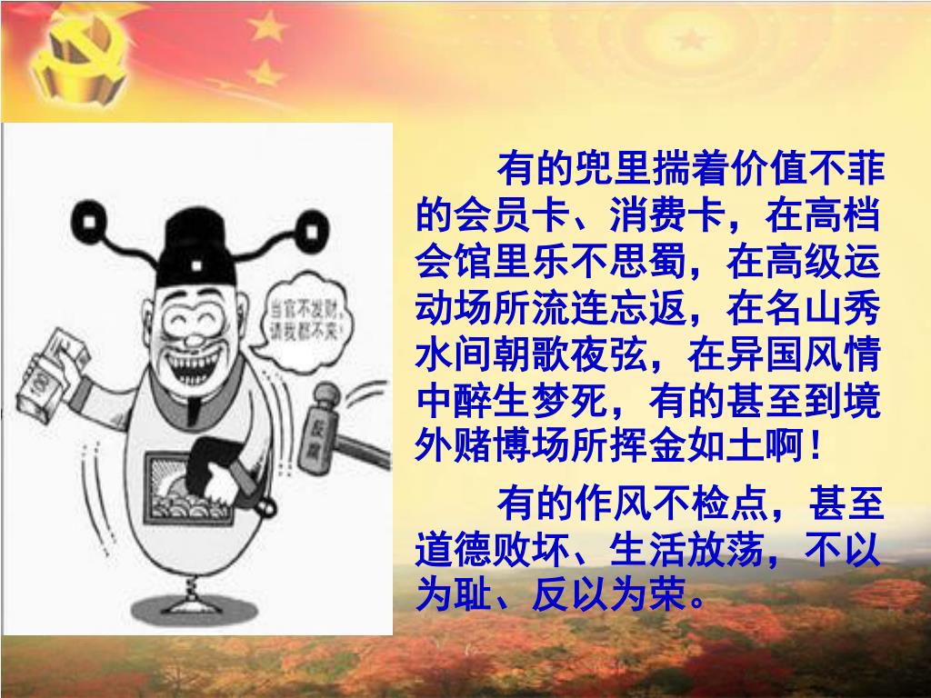 有的兜里揣着价值不菲的会员卡、消费卡,在高档会馆里乐不思蜀,在高级运动场所流连忘返,在名山秀水间朝歌夜弦,在异国风情中醉生梦死,有的甚至到境外赌博场所挥金如土啊! 有的兜里揣着价值不菲的会员卡、消费卡,在高档会馆里乐不思蜀,在高级运动场所流连忘返,在名山秀水间朝歌夜弦,在异国风情中醉生梦死,有的甚至到境外赌博场所挥金如土啊! 有的作风不检点,甚至道德败坏、生活放荡,不以为耻、反以为荣。