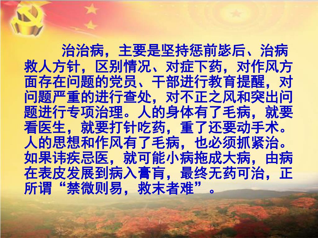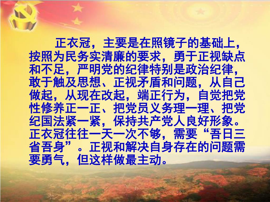 2.按照“总要求”解决作风方面存在的问题 这次教育实践活动借鉴延安整风经验,明确提出“照镜子、正衣冠、洗洗澡、治治病”的总要求。这4句话、12个字,概括起来就是要自我净化、自我完善、自我革新、自我提高。