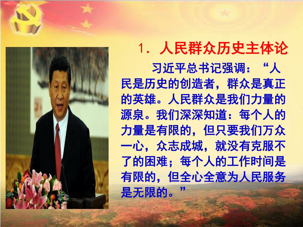 1.人民群众历史主体论 习近平总书记强调:“人民是历史的创造者,群众是真正的英雄。人民群众是我们力量的源泉。我们深深知道:每个人的力量是有限的,但只要我们万众一心,众志成城,就没有克服不了的困难;每个人的工作时间是有限的,但全心全意为人民服务是无限的。”