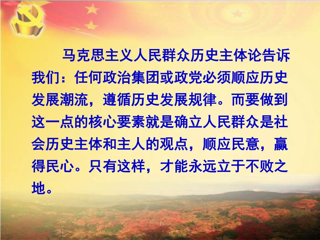 马克思主义人民群众历史主体论告诉我们:任何政治集团或政党必须顺应历史发展潮流,遵循历史发展规律。而要做到这一点的核心要素就是确立人民群众是社会历史主体和主人的观点,顺应民意,赢得民心。只有这样,才能永远立于不败之地。马克思主义人民群众历史主体论告诉我们:任何政治集团或政党必须顺应历史发展潮流,遵循历史发展规律。而要做到这一点的核心要素就是确立人民群众是社会历史主体和主人的观点,顺应民意,赢得民心。只有这样,才能永远立于不败之地。