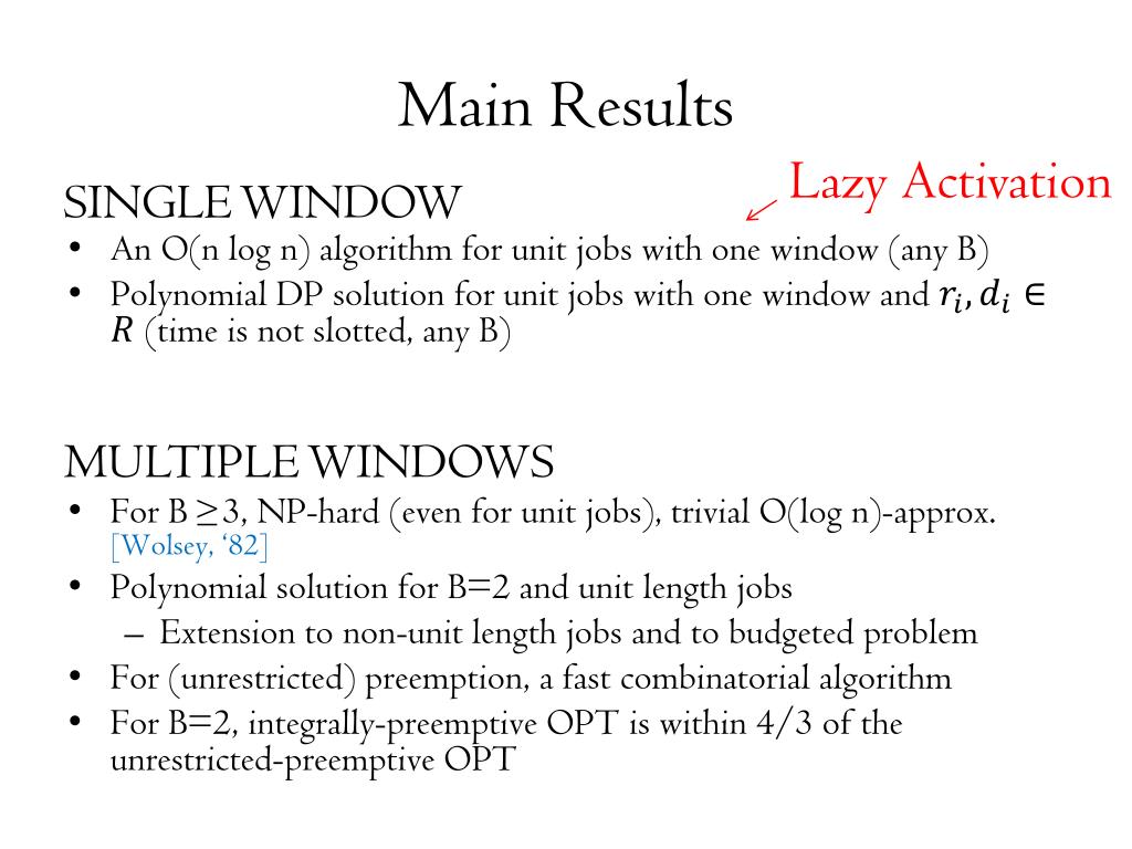Main Results Lazy Activation SINGLE WINDOW • An O(n log n) algorithm for unit jobs with one window (any B) • Polynomial DP solution for unit jobs with one window and (time is not slotted, any B) • For B ≥3, NP-hard (even for unit jobs), trivial O(log n)-approx. [Wolsey, ‘82] • Polynomial solution for B=2 and unit length jobs • Extension to non-unit length jobs and to budgeted problem • For (unrestricted) preemption, a fast combinatorial algorithm • For B=2, integrally-preemptive OPT is within 4/3 of the unrestricted-preemptive OPT MULTIPLE WINDOWS