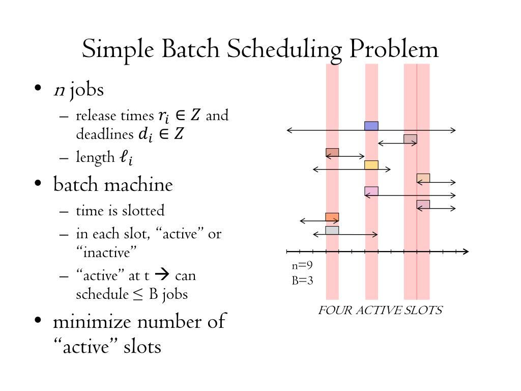 Simple Batch Scheduling Problem • n jobs • release times and deadlines • length • batch machine • time is slotted • in each slot, “active” or “inactive” • “active” at t can schedule ≤ B jobs • minimize number of “active” slots n=9 B=3 FOUR ACTIVE SLOTS