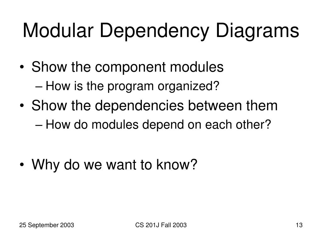 Modular Dependency Diagrams • Show the component modules • How is the program organized? • Show the dependencies between them • How do modules depend on each other? • Why do we want to know? CS 201J Fall 2003