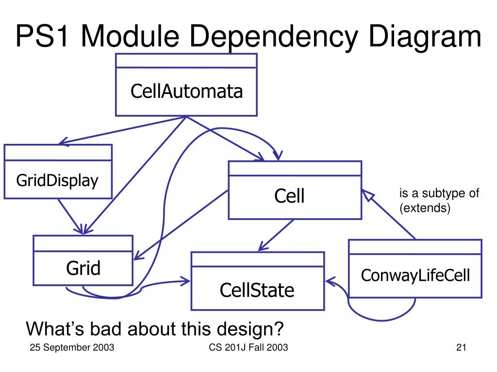 GridDisplay Cell PS1 Module Dependency Diagram CellAutomata is a subtype of (extends) Grid ConwayLifeCell CellState What’s bad about this design? CS 201J Fall 2003