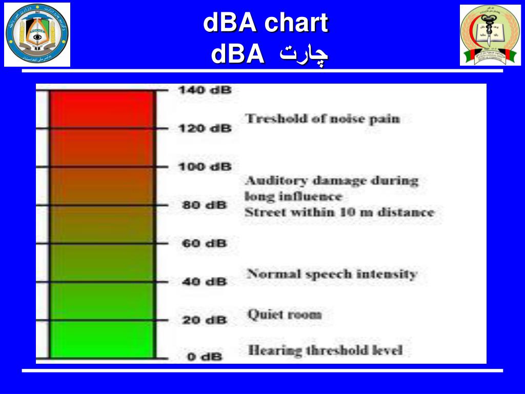 At Riskدر معرض خطر • Noise - unwanted sounds • Potentially hazardous noise • Continuous noise at >84 dBA • Impact or Impulse Noise at ≥140 dBA • سروصدا – صداهای ناخواسته • بصورت بلقوه سروصدای مضر است • سروصدای دوامدار که شدت ان از 84 دیسیبل یا dBA زیاد باشد • سروصدای ضربه ای بیشتر و مساوی به 140 dBA دیسبل است