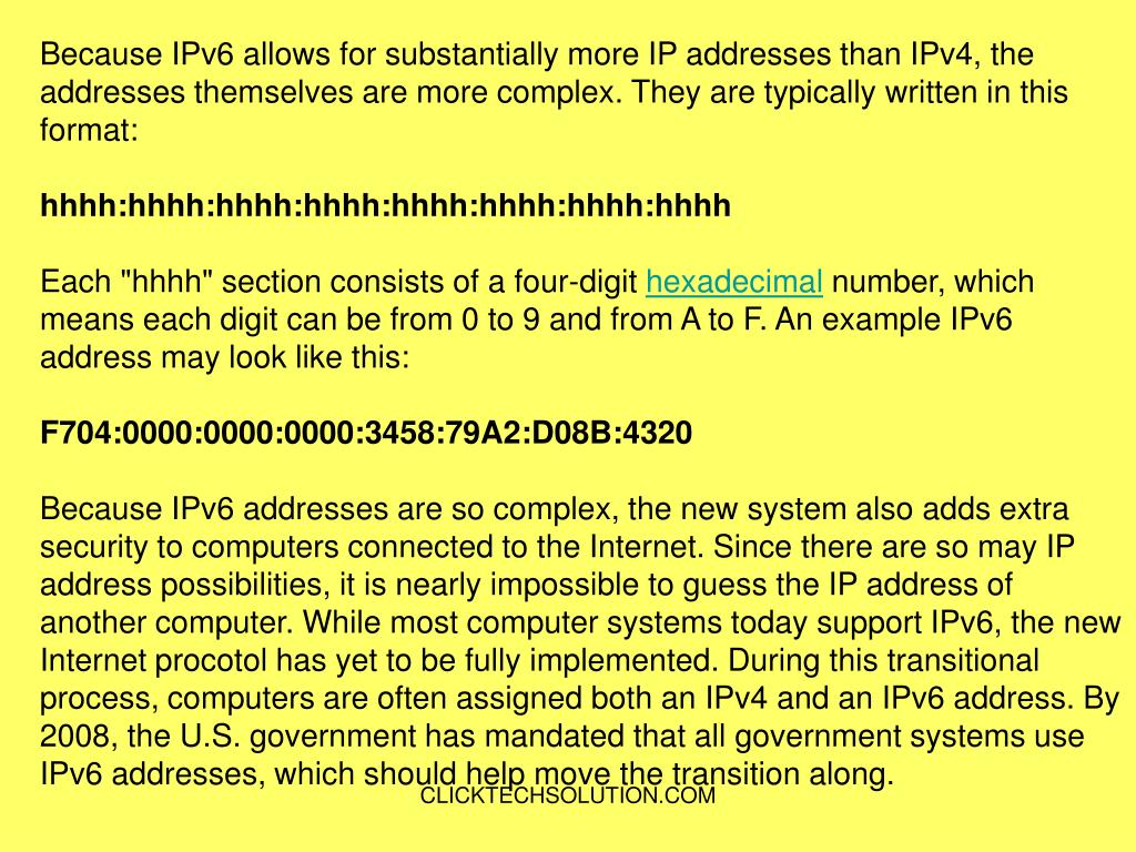 Because IPv6 allows for substantially more IP addresses than IPv4, the addresses themselves are more complex. They are typically written in this format:hhhh:hhhh:hhhh:hhhh:hhhh:hhhh:hhhh:hhhhEach "hhhh" section consists of a four-digit hexadecimal number, which means each digit can be from 0 to 9 and from A to F. An example IPv6 address may look like this:F704:0000:0000:0000:3458:79A2:D08B:4320Because IPv6 addresses are so complex, the new system also adds extra security to computers connected to the Internet. Since there are so may IP address possibilities, it is nearly impossible to guess the IP address of another computer. While most computer systems today support IPv6, the new Internet procotol has yet to be fully implemented. During this transitional process, computers are often assigned both an IPv4 and an IPv6 address. By 2008, the U.S. government has mandated that all government systems use IPv6 addresses, which should help move the transition along. CLICKTECHSOLUTION.COM