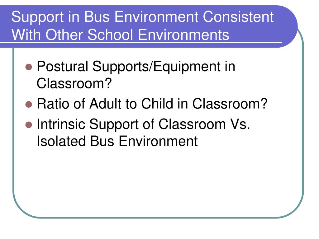 Support in Bus Environment Consistent With Other School Environments • Postural Supports/Equipment in Classroom? • Ratio of Adult to Child in Classroom? • Intrinsic Support of Classroom Vs. Isolated Bus Environment