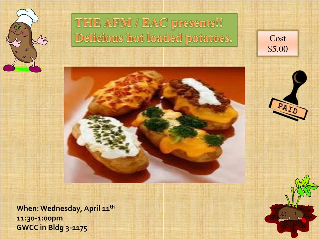 THE AFM / EAC presents!! Delicious hot loaded potatoes. Cost $5.00. When: Wednesday, April 11 th 11:30-1:00pm GWCC in Bldg 3-1175.