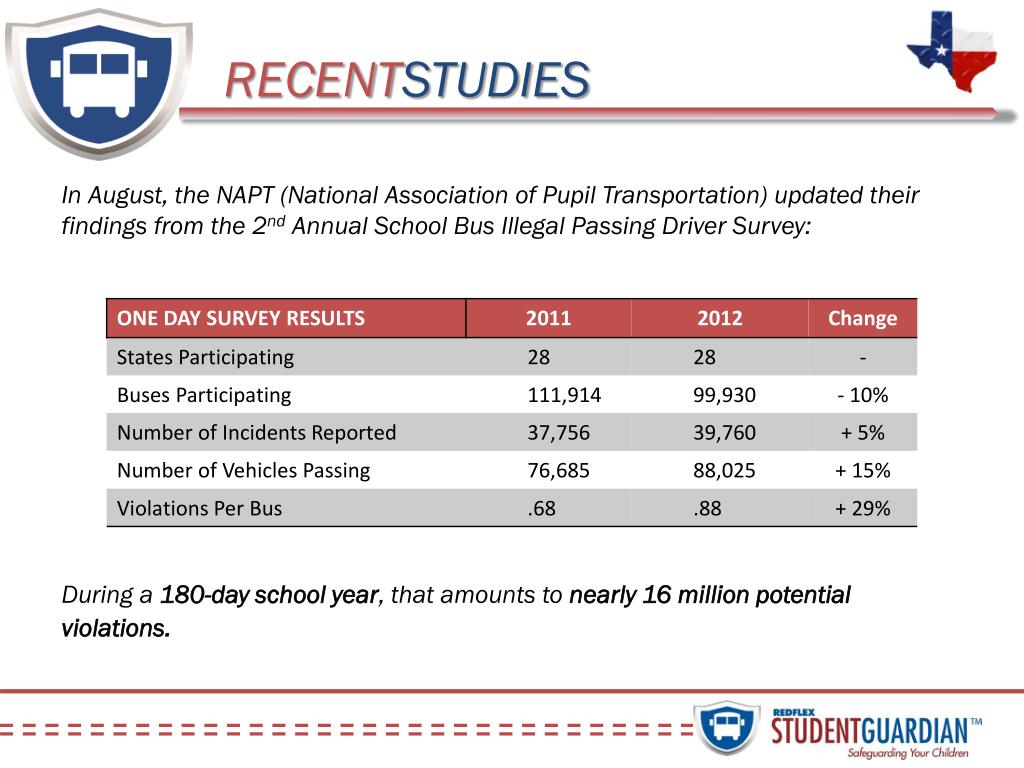 RECENTSTUDIES In August, the NAPT (National Association of Pupil Transportation) updated their findings from the 2nd Annual School Bus Illegal Passing Driver Survey: During a 180-day school year, that amounts to nearly 16 million potential violations.