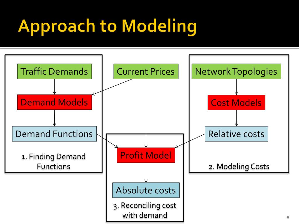 Approach to Modeling 1. Finding Demand Functions 2. Modeling Costs Traffic Demands Network Topologies Current Prices Demand Models Cost Models Demand Functions Relative costs 3. Reconciling cost with demand Profit Model Absolute costs