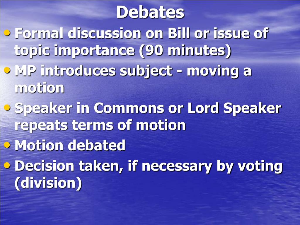 Debates • Formal discussion on Bill or issue of topic importance (90 minutes) • MP introduces subject - moving a motion • Speaker in Commons or Lord Speaker repeats terms of motion • Motion debated • Decision taken, if necessary by voting (division)