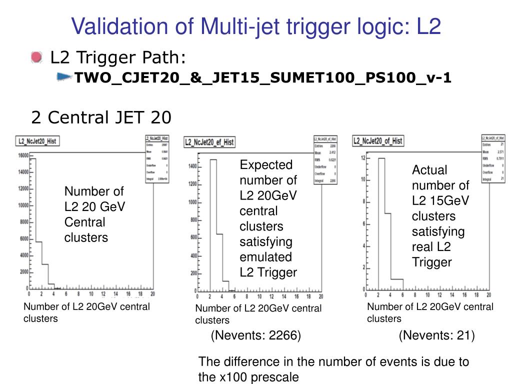 Validation of Multi-jet trigger logic: L2 • L2 Trigger Path: • TWO_CJET20_&_JET15_SUMET100_PS100_v-1 2 Central JET 20 Expected number of L2 20GeV central clusters satisfying emulated L2 Trigger Actual number of L2 15GeV clusters satisfying real L2 Trigger Number of L2 20 GeV Central clusters Number of L2 20GeV central clusters Number of L2 20GeV central clusters Number of L2 20GeV central clusters (Nevents: 2266) (Nevents: 21) The difference in the number of events is due to the x100 prescale