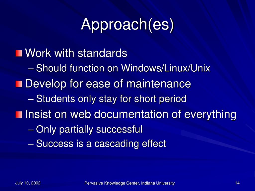 Approach(es) • Work with standards • Should function on Windows/Linux/Unix • Develop for ease of maintenance • Students only stay for short period • Insist on web documentation of everything • Only partially successful • Success is a cascading effect Pervasive Knowledge Center, Indiana University