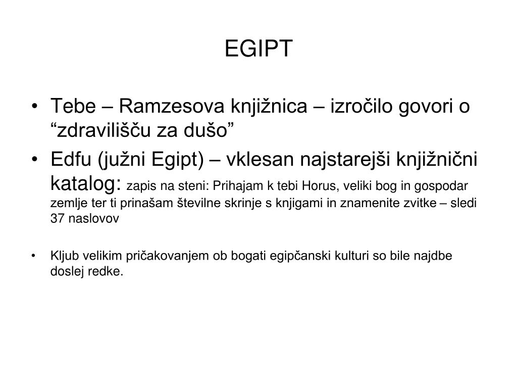 EGIPT • Tebe – Ramzesova knjižnica – izročilo govori o “zdravilišču za dušo” • Edfu (južni Egipt) – vklesan najstarejši knjižnični katalog: zapis na steni: Prihajam k tebi Horus, veliki bog in gospodar zemlje ter ti prinašam številne skrinje s knjigami in znamenite zvitke – sledi 37 naslovov • Kljub velikim pričakovanjem ob bogati egipčanski kulturi so bile najdbe doslej redke.