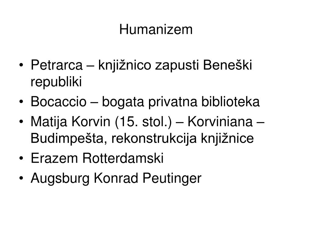 Humanizem • Petrarca – knjižnico zapusti Beneški republiki • Bocaccio – bogata privatna biblioteka • Matija Korvin (15. stol.) – Korviniana – Budimpešta, rekonstrukcija knjižnice • Erazem Rotterdamski • Augsburg Konrad Peutinger