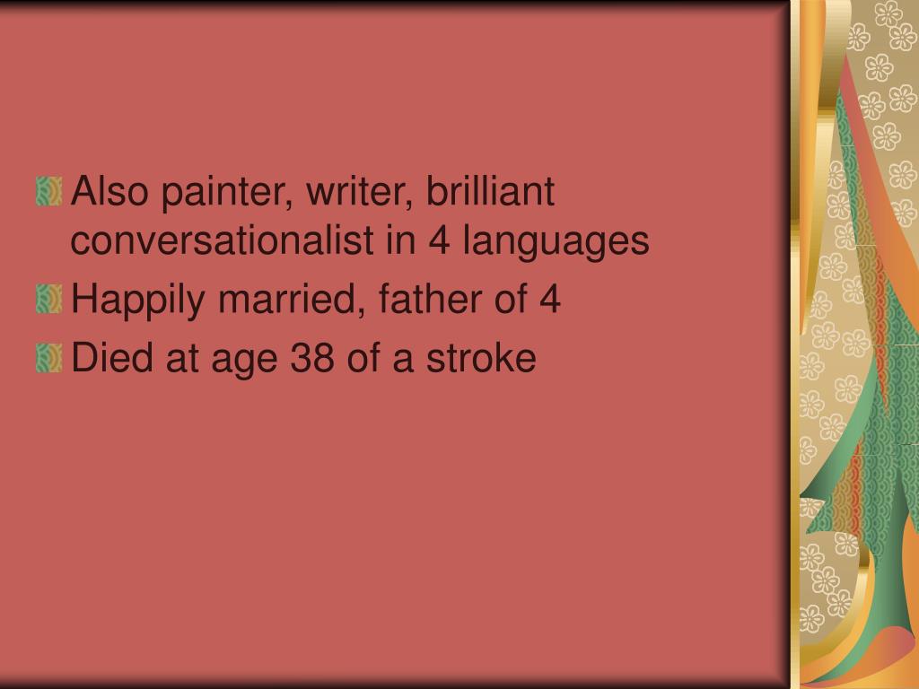 Also painter, writer, brilliant conversationalist in 4 languages • Happily married, father of 4 • Died at age 38 of a stroke