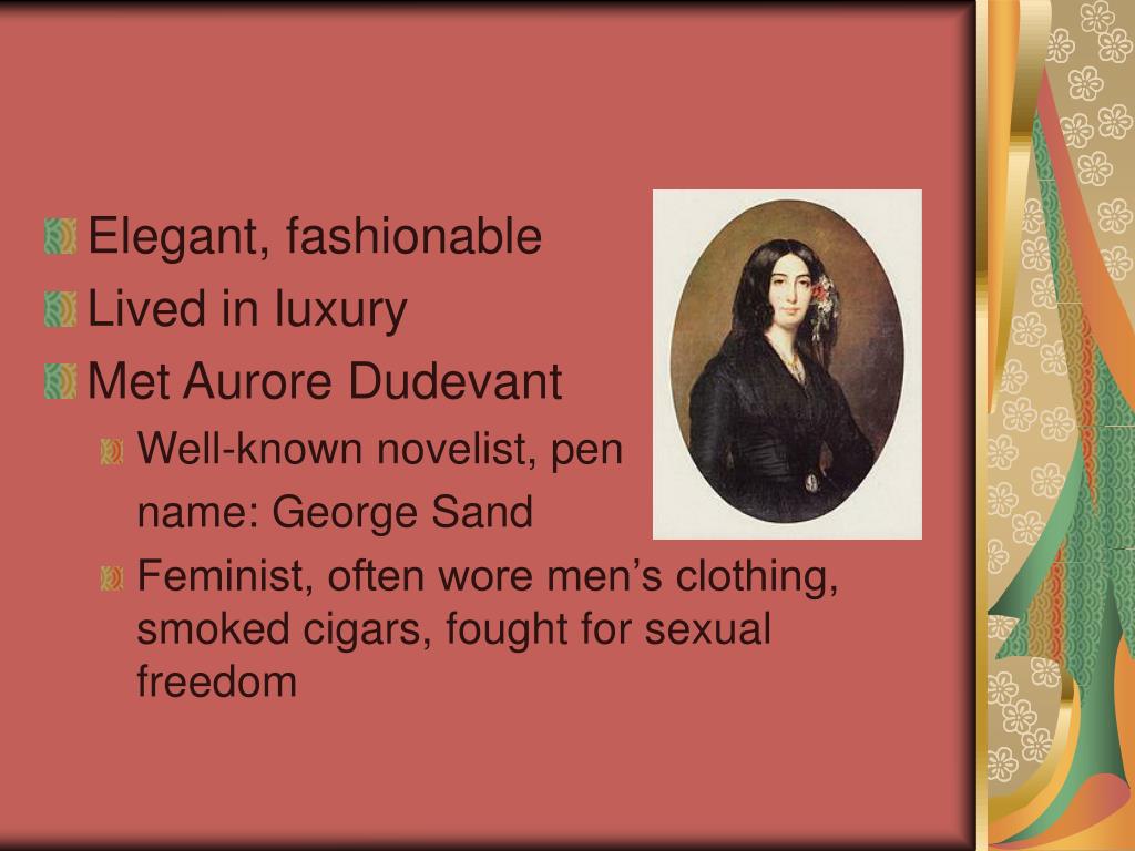 Elegant, fashionable • Lived in luxury • Met Aurore Dudevant • Well-known novelist, pen name: George Sand • Feminist, often wore men’s clothing, smoked cigars, fought for sexual freedom