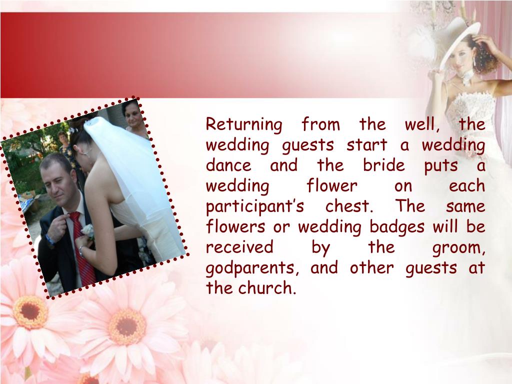 Returning from the well, the wedding guests start a wedding dance and the bride puts a wedding flower on each participant’s chest. The same flowers or wedding badges will be received by the groom, godparents, and other guests at the church.
