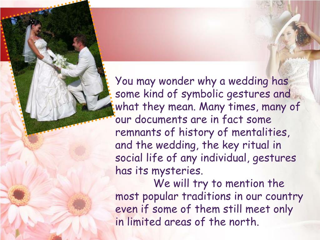 You may wonder why a wedding has some kind of symbolic gestures and what they mean. Many times, many of our documents are in fact some remnants of history of mentalities, and the wedding, the key ritual in social life of any individual, gestures has its mysteries. We will try to mention the most popular traditions in our country even if some of them still meet only in limited areas of the north.