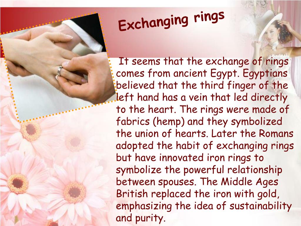 Exchanging rings It seems that the exchange of rings comes from ancient Egypt. Egyptians believed that the third finger of the left hand has a vein that led directly to the heart. The rings were made of fabrics (hemp) and they symbolized the union of hearts. Later the Romans adopted the habit of exchanging rings but have innovated iron rings to symbolize the powerful relationship between spouses. The Middle Ages British replaced the iron with gold, emphasizing the idea of sustainability and purity.