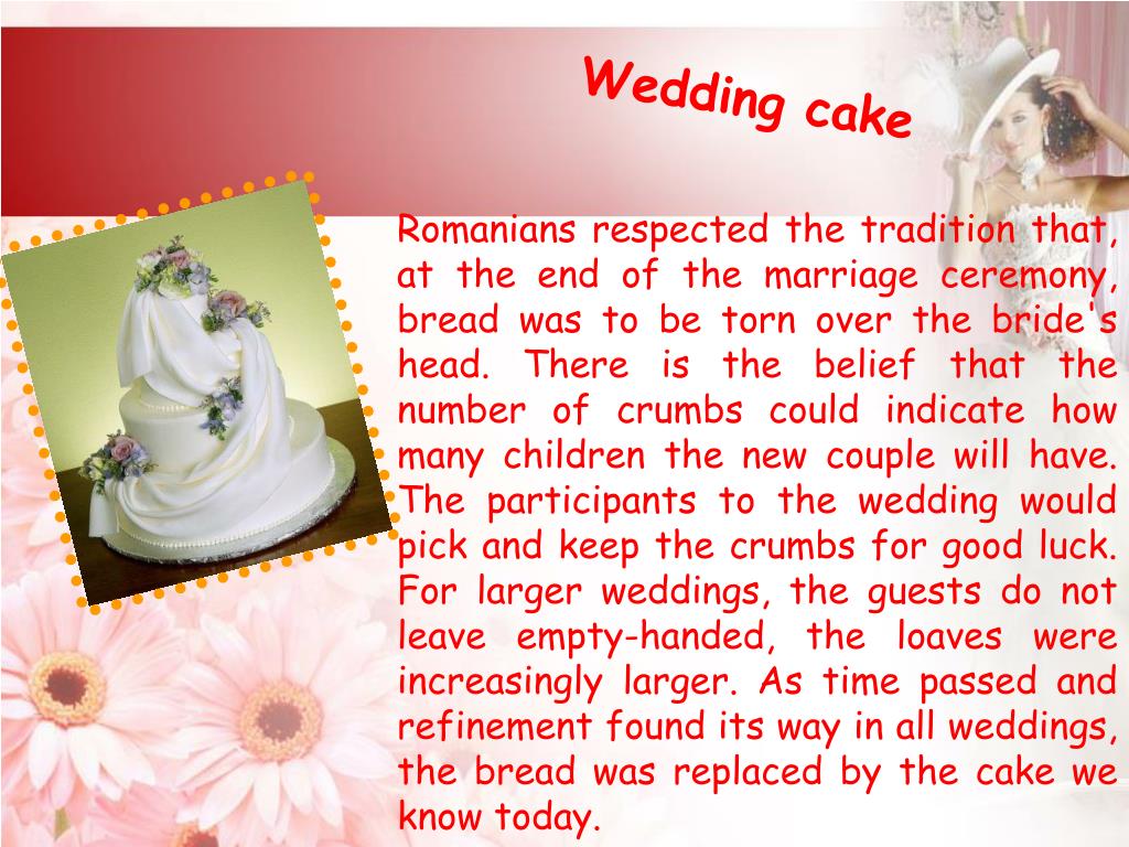 Wedding cake Romanians respected the tradition that, at the end of the marriage ceremony, bread was to be torn over the bride's head. There is the belief that the number of crumbs could indicate how many children the new couple will have. The participants to the wedding would pick and keep the crumbs for good luck. For larger weddings, the guests do not leave empty-handed, the loaves were increasingly larger. As time passed and refinement found its way in all weddings, the bread was replaced by the cake we know today.