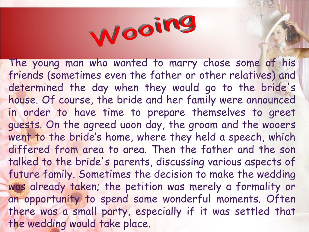 Wooing The young man who wanted to marry chose some of his friends (sometimes even the father or other relatives) and determined the day when they would go to the bride's house. Of course, the bride and her family were announced in order to have time to prepare themselves to greet guests. On the agreed uoon day, the groom and the wooers went to the bride’s home, where they held a speech, which differed from area to area. Then the father and the son talked to the bride's parents, discussing various aspects of future family. Sometimes the decision to make the wedding was already taken; the petition was merely a formality or an opportunity to spend some wonderful moments. Often there was a small party, especially if it was settled that the wedding would take place.