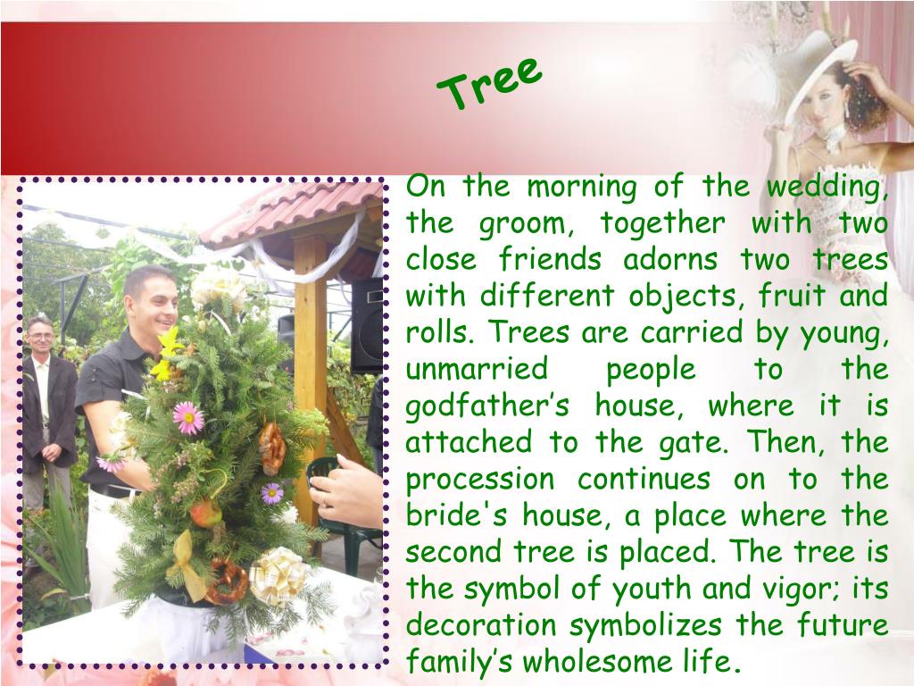 Tree On the morning of the wedding, the groom, together with two close friends adorns two trees with different objects, fruit and rolls. Trees are carried by young, unmarried people to the godfather’s house, where it is attached to the gate. Then, the procession continues on to the bride's house, a place where the second tree is placed. The tree is the symbol of youth and vigor; its decoration symbolizes the future family’s wholesome life.