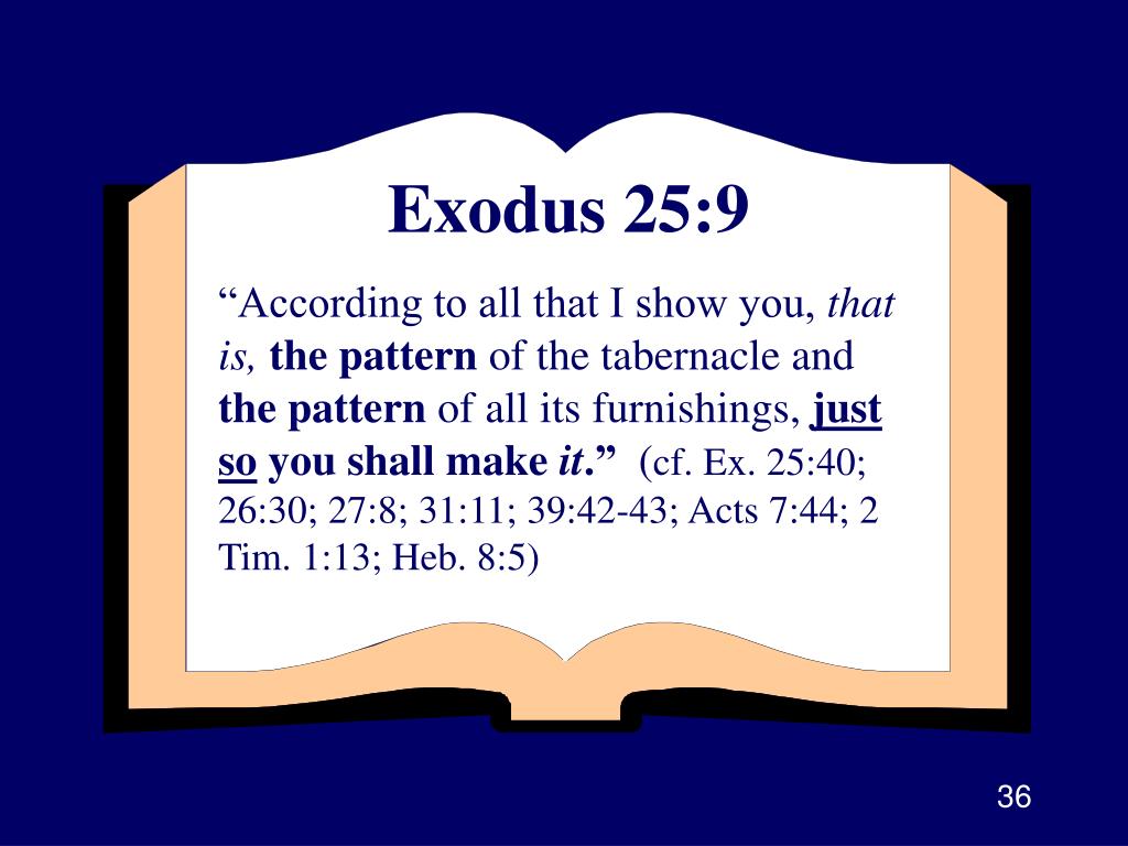 Exodus 25:9 “According to all that I show you, that is,the pattern of the tabernacle and the pattern of all its furnishings, justso you shall make it.” (cf. Ex. 25:40; 26:30; 27:8; 31:11; 39:42-43; Acts 7:44; 2 Tim. 1:13; Heb. 8:5)