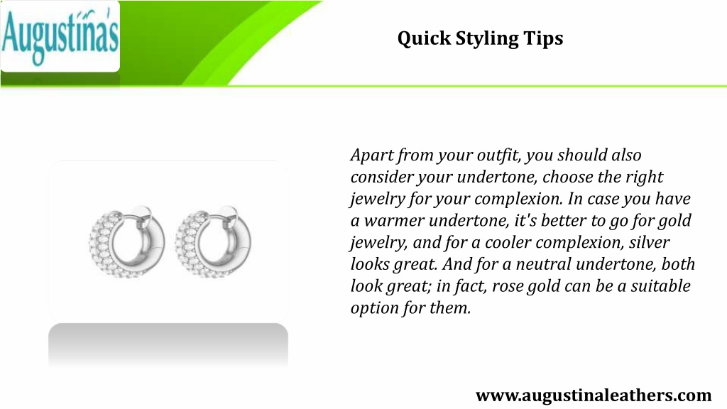 Quick Styling Tips Apart from your outfit, you should also consider your undertone, choose the right jewelry for your complexion. In case you have a warmer undertone, it's better to go for gold jewelry, and for a cooler complexion, silver looks great. And for a neutral undertone, both look great; in fact, rose gold can be a suitable option for them. www.augustinaleathers.com