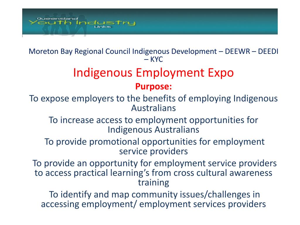 Moreton Bay Regional Council Indigenous Development – DEEWR – DEEDI – KYC Indigenous Employment Expo Purpose: To expose employers to the benefits of employing Indigenous Australians To increase access to employment opportunities for Indigenous Australians To provide promotional opportunities for employment service providers To provide an opportunity for employment service providers to access practical learning’s from cross cultural awareness training To identify and map community issues/challenges in accessing employment/ employment services providers