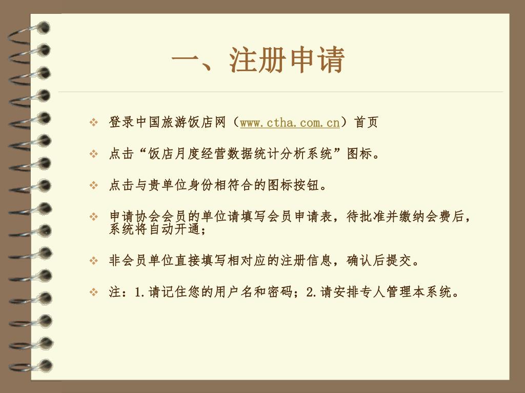 欢迎参加 饭店月度经营数据统计分析 系统. 一、注册申请. 登录中国旅游饭店网( www.ctha.com.cn )首页 点击“饭店月度经营数据统计分析系统”图标。 点击与贵单位身份相符合的图标按钮。 申请协会会员的单位请填写会员申请表,待批准并缴纳会费后,系统将自动开通; 非会员单位直接填写相对应的注册信息,确认后提交。 注: 1. 请记住您的用户名和密码; 2. 请安排专人管理本系统。. 二、提交数据. 注册完成并通过审核后,凭用户名和密码登陆参与。 为保证数据统计的时效性,请于每月 10 日前提交上月度本单位准确、真实的数据,最迟不晚于月底前。