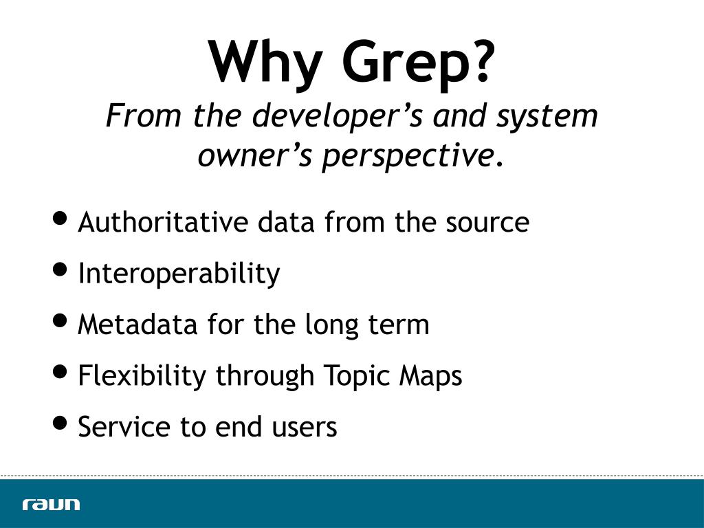 Why Grep?From the developer’s and system owner’s perspective. • Authoritative data from the source • Interoperability • Metadata for the long term • Flexibility through Topic Maps • Service to end users