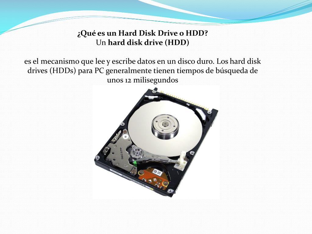 ¿Qué es un Hard Disk Drive o HDD? Un hard disk drive (HDD) es el mecanismo que lee y escribe datos en un disco duro. Los hard disk drives (HDDs) para PC generalmente tienen tiempos de búsqueda de unos 12 milisegundos
